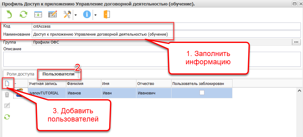 • В созданной карточке указать код и наименование, на закладке «Пользователи» добавить пользователей профиля.