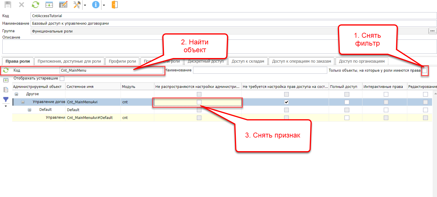 • В карточке роли перейти на закладку «Права роли». Найти в списке объектов приложение по его коду (узнать его можно на закладке «Приложения, доступные для роли»). Снять признак «Не распространяются настройки администрирования».