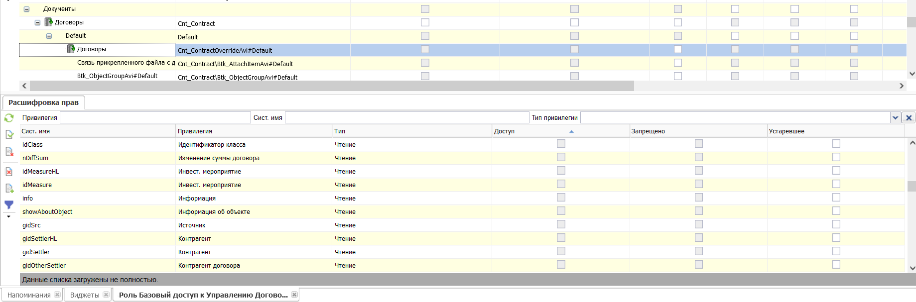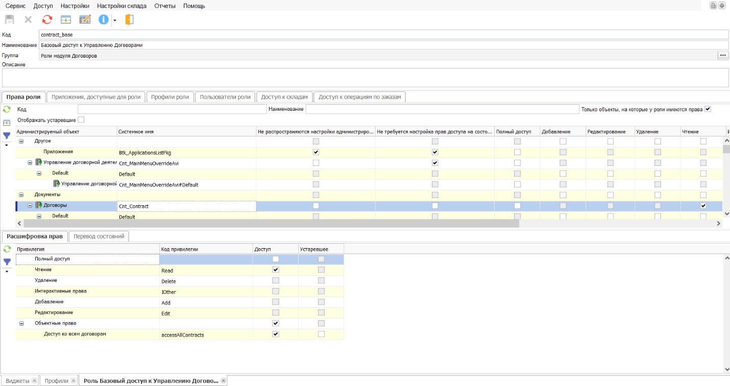 Содержат список системных привилегий — особых прав для данного объекта. Например, для договоров имеется объектное право «Доступ ко всем договорам», которое открывает владельцу возможность просмотра договоров любых ОФС. Активный признак «Не распространяются настройки администрирования» не дает доступ к объектным правам