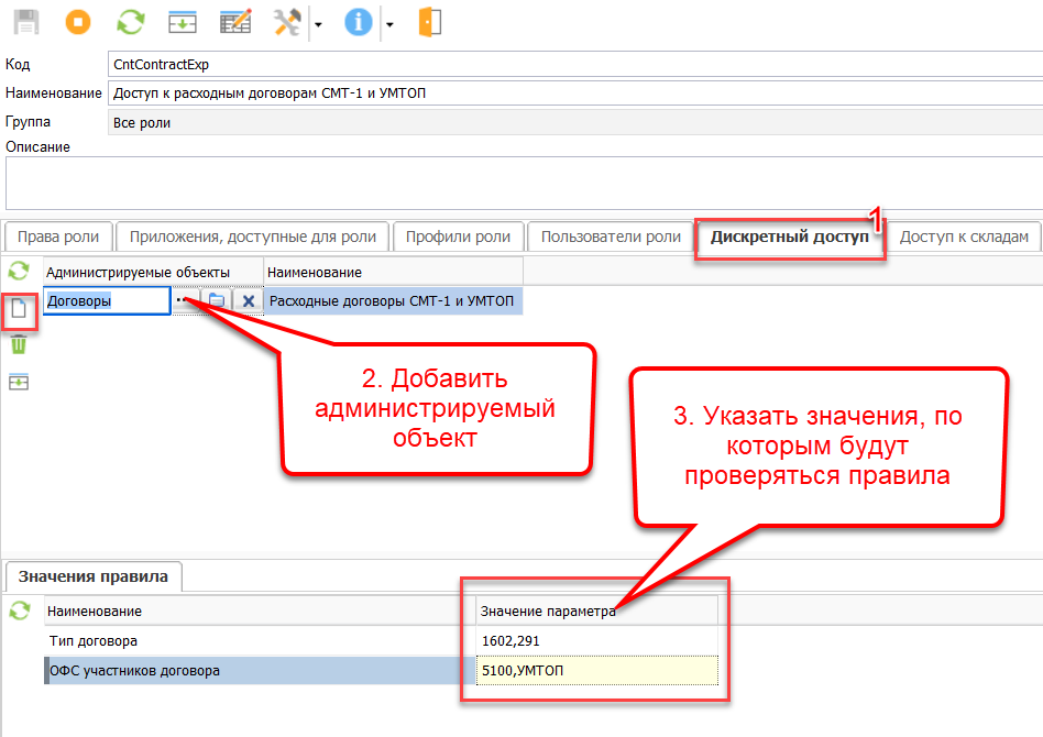 • В карточке роли перейти на закладку «Дискретный доступ» и добавить администрируемый объект, доступ к которому необходимо настроить. В детализации на закладке «Значения правила» указать значения, по которым будут проверяться правила.