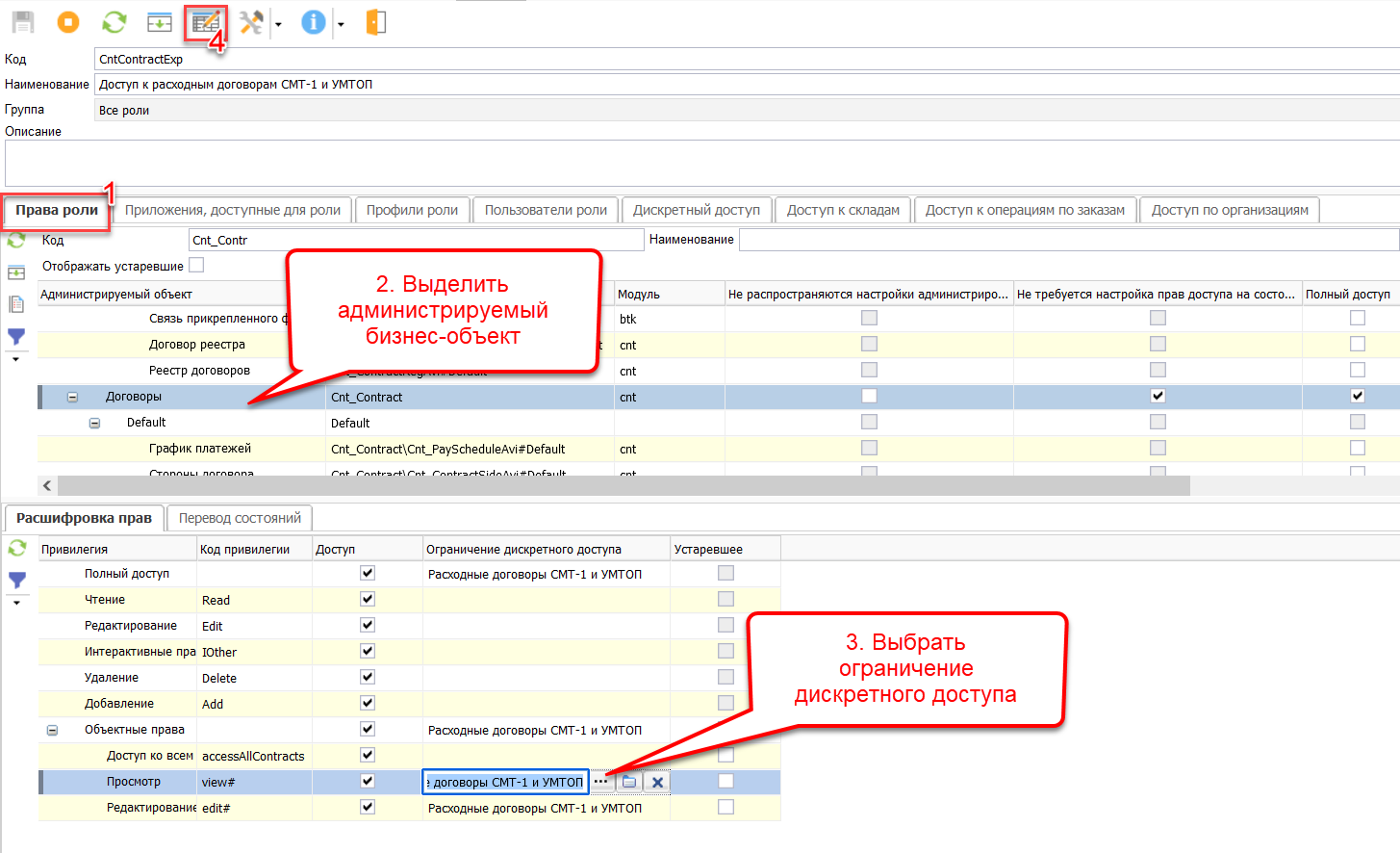 • На закладке «Права роли» найти и выделить администрируемый бизнес-объект. В детализации «Расшифровка прав» выбрать настроенное ограничение для прав на просмотр или редактирование объектов.