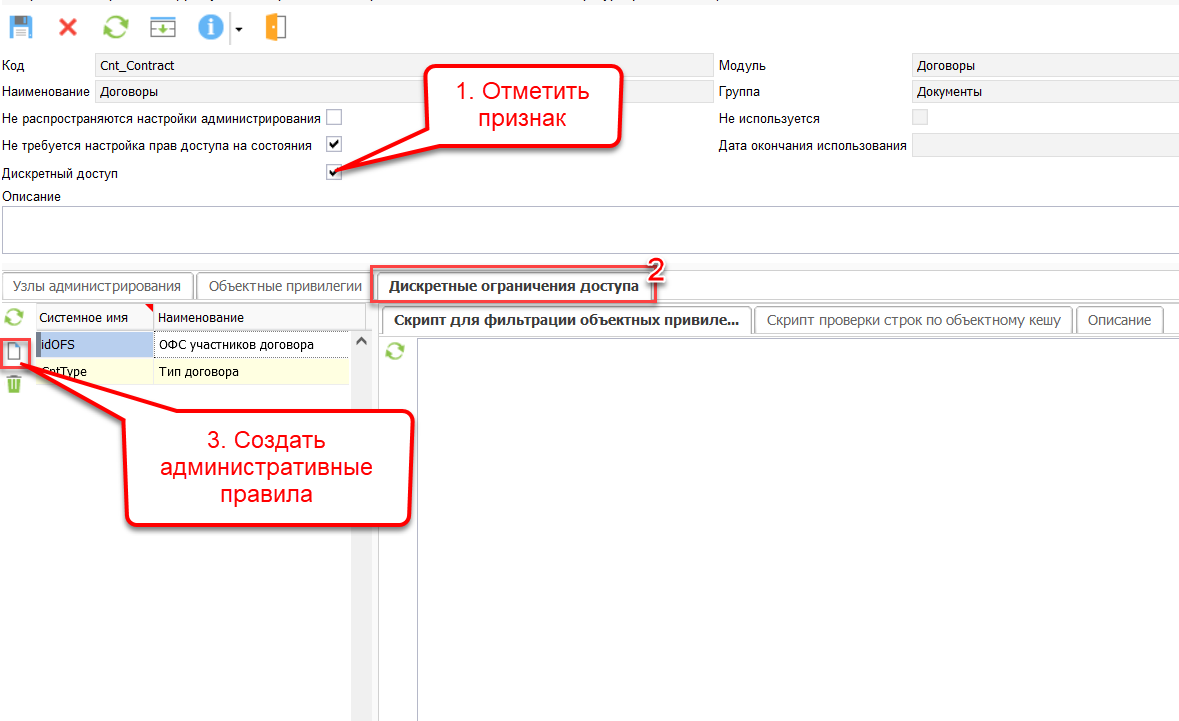 • Для каждого правила вставить переданные разработчиками скрипты на закладках «Скрипт для фильтрации объектных привилегий» (отвечает за фильтрацию объектов в списках. В примере данного прецедента — скрывает из перечня договоры других типов и ОФС) и «Скрипт проверки строк по объектному кешу» (блокирует возможность открытия недоступных договоров по ссылке из прочих документов, например, запрещает пользователю открыть карточку недоступного договора из лота).