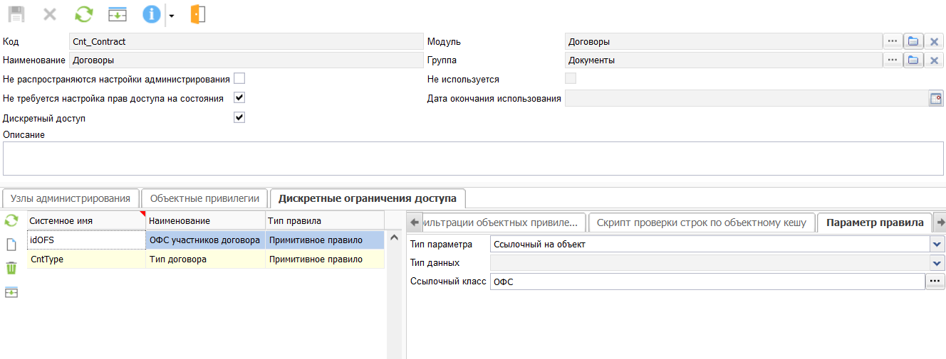• В справочнике администрируемых объектов (Приложение «Администратор», Настройки -> Администрируемые объекты) найти требуемый — Cnt_Contract и перейти в его карточку.