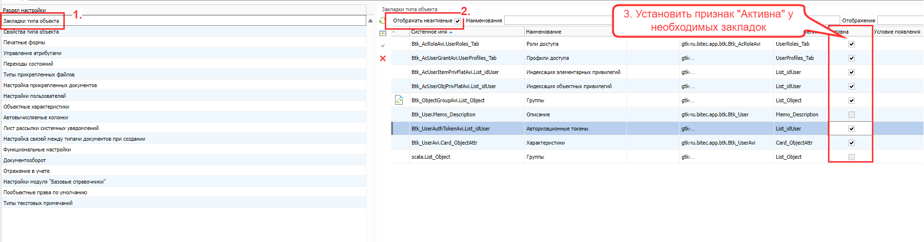 Выбрав созданный тип перейдите во вкладку «Закладки типа объекта», и задайте отображение необходимых закладок.
