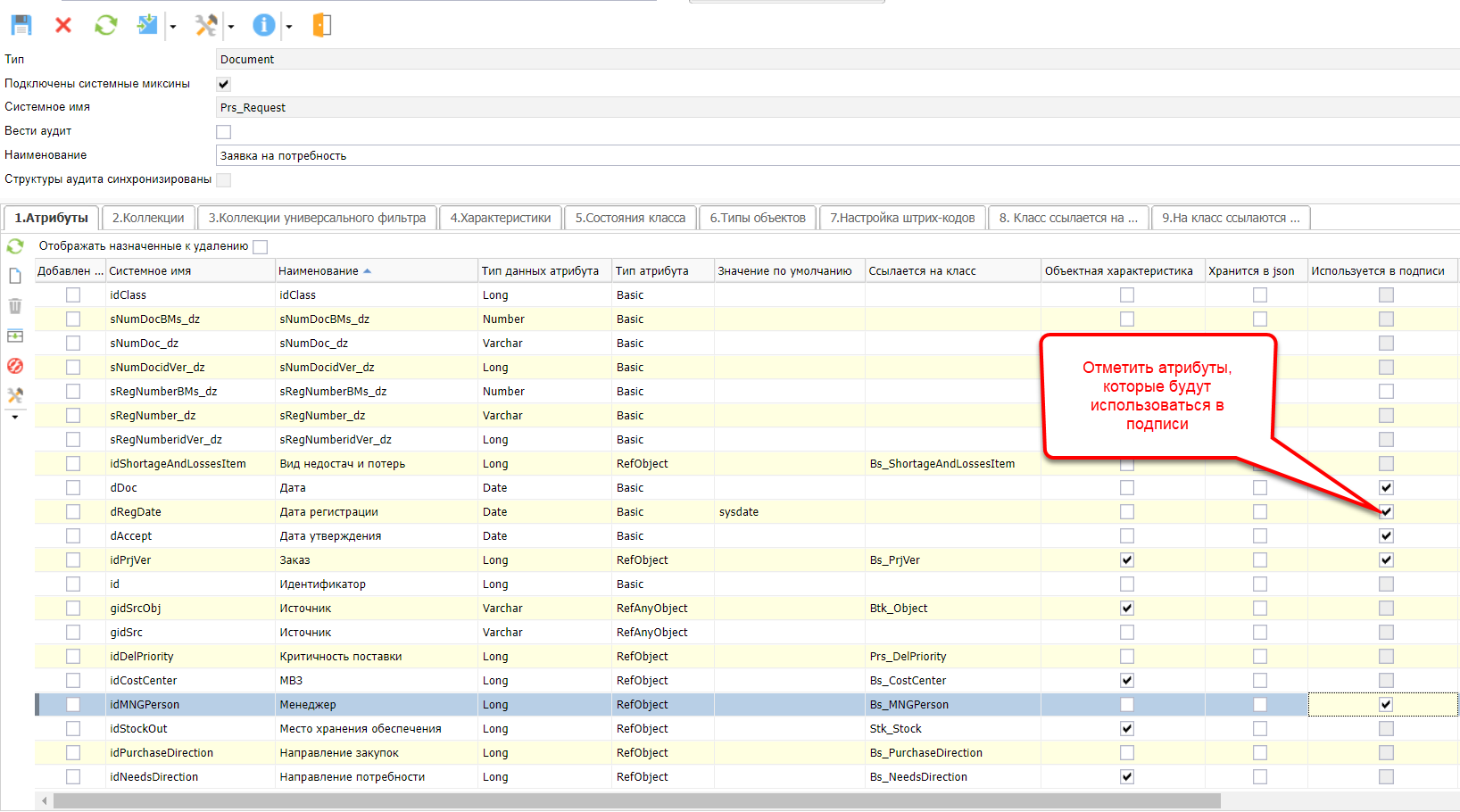 • В списке атрибутов класса отметить признаками те атрибуты, которые будут использоваться в электронной подписи.