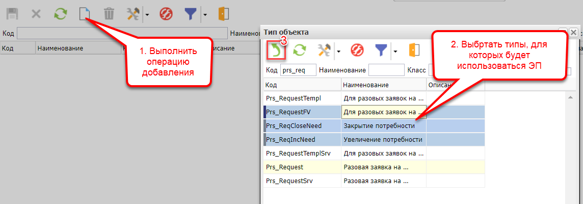 • Перейти в список типов объектов, к которым применимы ЭП (Сервисы -> Настройка ЭП -> Подписи на тип объекта) и добавить требуемые типы. Доступна более общая настройка по целым классам (Сервисы -> Настройка ЭП -> Подписи на класс)