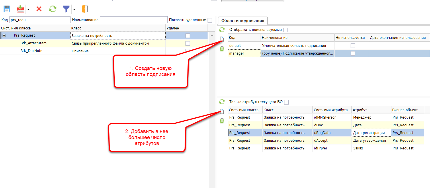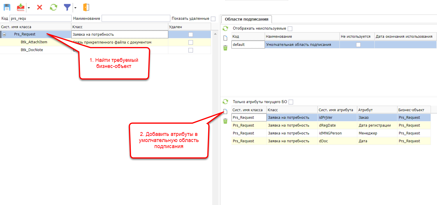 • В справочнике бизнес-объектов (Сущности -> Бизнес-объекты) найти требуемый бизнес-объект. Добавить в умолчательную область подписания атрибуты.