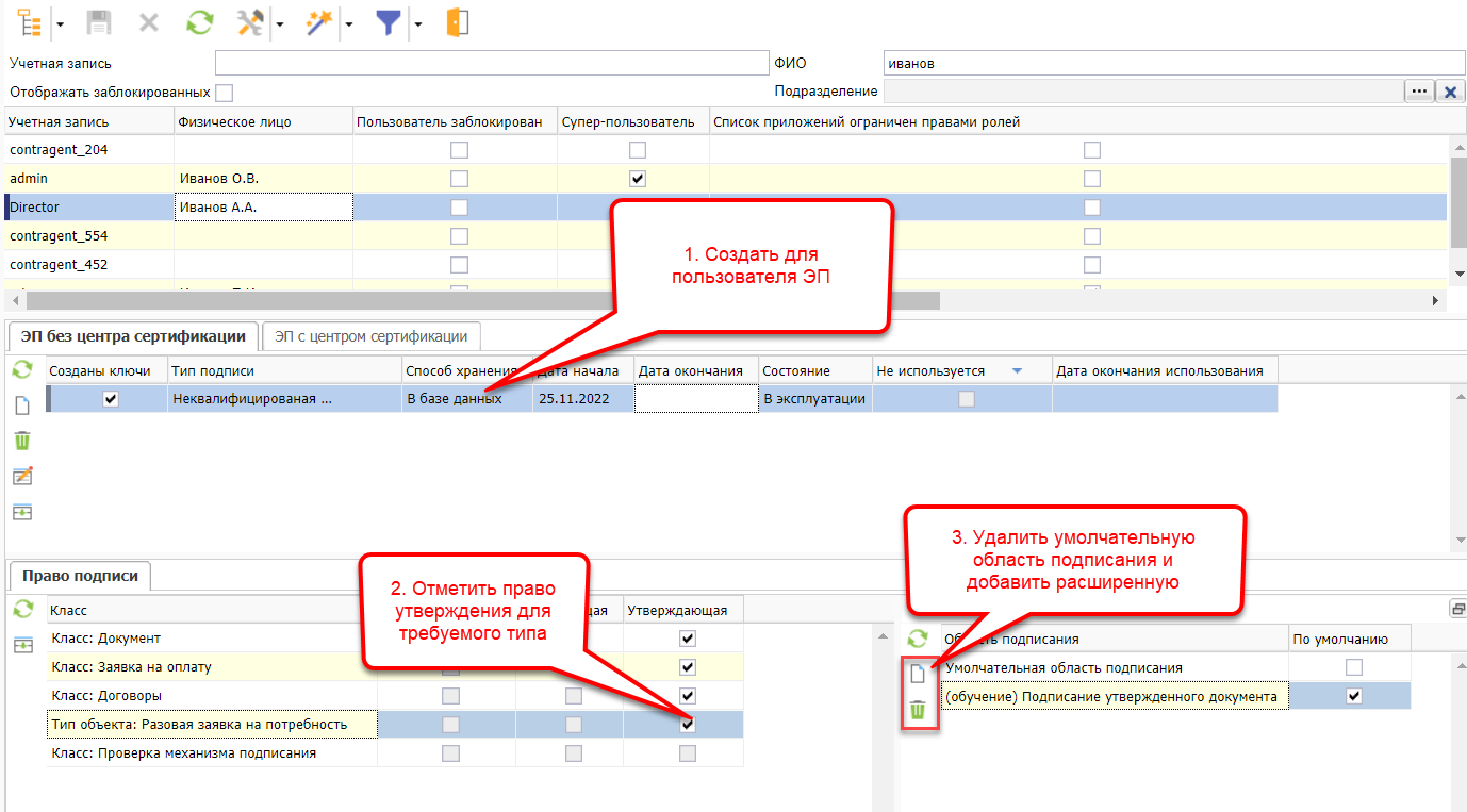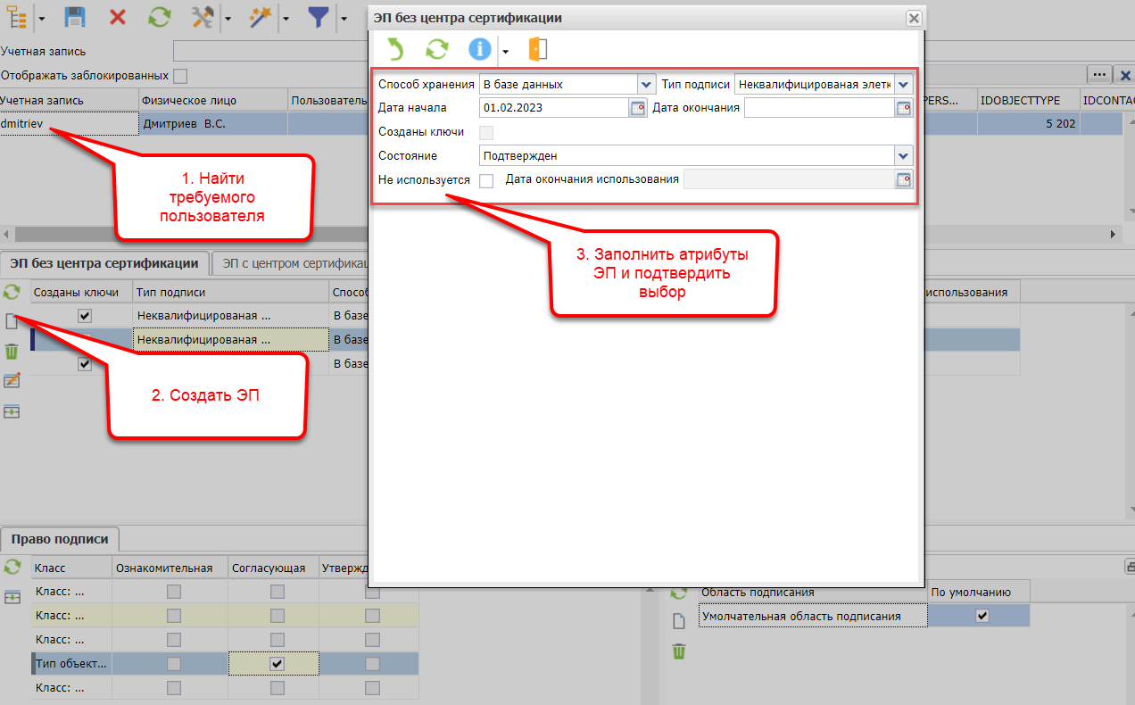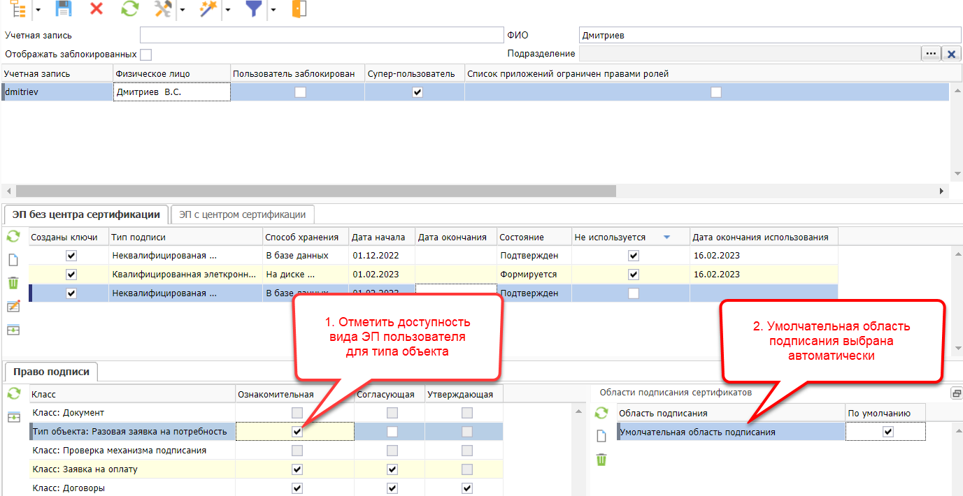• Аналогичным образом для пользователя, который будет утверждать документ, создать ЭП. Отметить право утверждения для данной ЭП и выбрать ранее настроенную область подписания с бóльшим набором атрибутов.