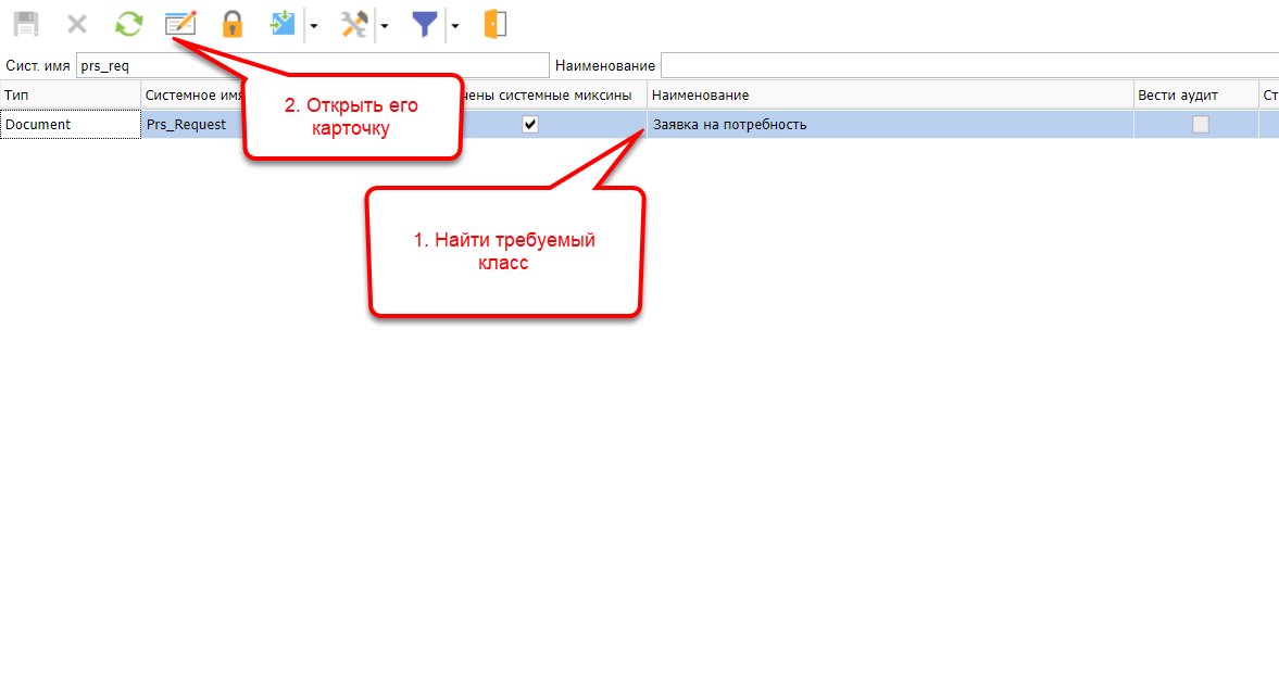 • В приложении «Настройка системы» перейти в перечень классов системы (Сущности -> Классы) и найти требуемый (Prs_Request). Перейти в его карточку.