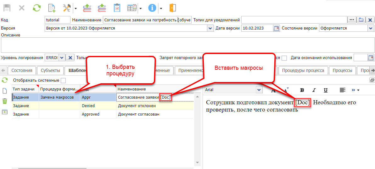 • На закладке «Шаблоны задач» (либо открыв карточку шаблона с графической схемы) указать для шаблона процедуру «Замена макросов» и вставить макросы в текст наименования или текста задачи. При формировании задач по данному шаблону макросы будут заменены на соответствующий текст.