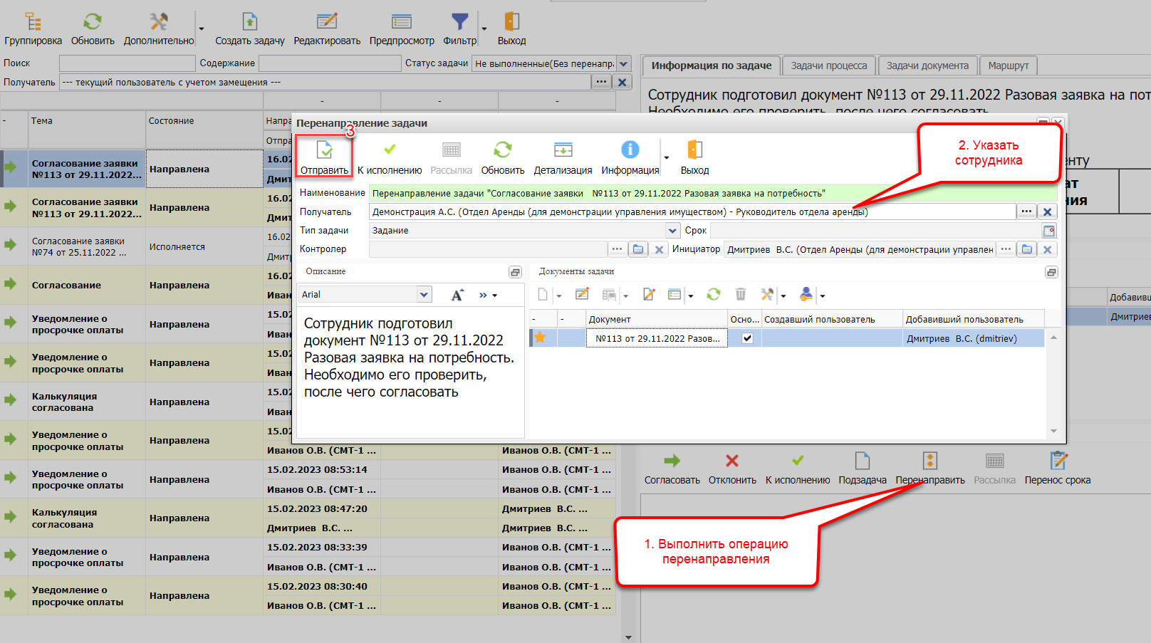 • Для перенаправления задачи необходимо выполнить соответствующую операцию и указать получателя перенаправленной задачи.