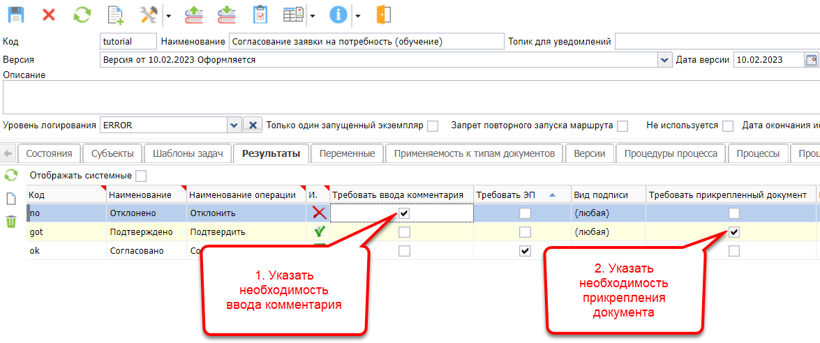 • Перейти на закладку «Результаты» (либо открыв карточку результата от потока графической схемы аналогично пункту 3 выше) и для требуемого результата отметить соответствующие признаки. При выполнении задач с данными результатами будет отображено требование ввода комментария или прикрепления документа соответственно.