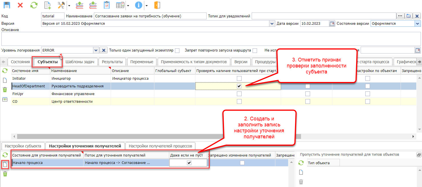 • На закладке «Субъект процесса» расположен перечень всех субъектов процесса и всех определенных для них пользователей.
