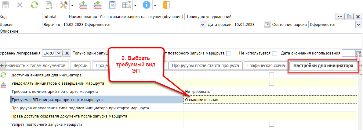 • В схеме процесса перейти на закладку «Настройки для инициатора» и указать требуемый вид ЭП для запуска маршрута.