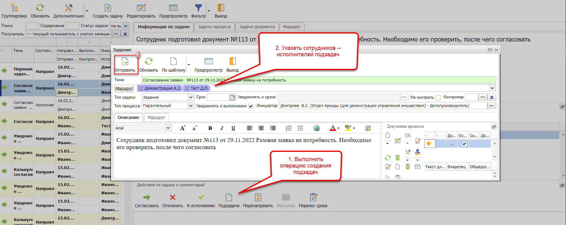 • Для создания подзадач необходимо выполнить соответствующую операцию и выбрать сотрудников, которым будут направлены подзадачи. Доступно указание срока исполнения, ввод собственного текста задачи и выбор типа процесса, определяющего, последовательно ли пользователи будут получать задачи или параллельно.
