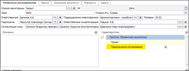 Для того, чтобы определить, будет согласование происходить параллельно или последовательно, для документа была добавлена и выведена в фрейм характеристик объектная характеристика «Параллельное согласование».
