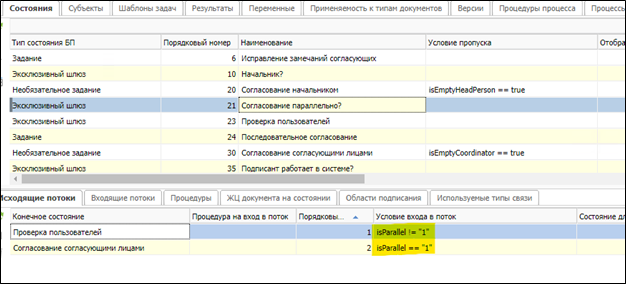 Далее в состоянии «Согласование параллельно?» с типом эксклюзивный шлюз, в зависимости от значения переменной, определяется последовательно или параллельно документ будут согласовывать согласующие лица.