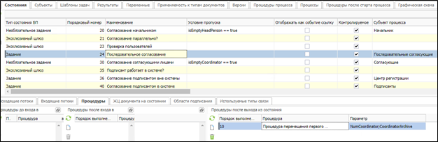 На состоянии «Последовательное согласование» согласующему из субъекта «Последовательные согласующие» приходит задача на согласование. В случае успешного согласования, выполняется процедура «Процедура перемещения первого пользователя субъекта в другой субъект», которая перемещает исполнителя из субъекта «Последовательные согласующие» (NumCoordinator) в субъект «Архив согласующих» (CoordinatorArchive).
