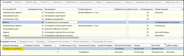 Если значение переменной «Отсутствует последовательный согласующий» = 1 (для субъекта не указан пользователь, что предполагает, что все исполнители завершили последовательное согласование), происходит переход в состояние «Подписант работает в системе?», что по сути является выходом из последовательного согласования на маршруте.