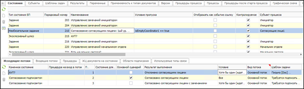 Для перехода №3 настроено условие «Хотя бы один (ждать всех)» – аналогично потоку №1, чтобы маршрут перешел в данный поток, хотя бы один исполнитель должен выполнить задачу с результатом «Согласовано согласующими лицами с замечаниями». Так как на состоянии настроено два потока с условием «Хотя бы один (ждать всех)», приоритет входа в поток определяется по порядковому номеру потока.