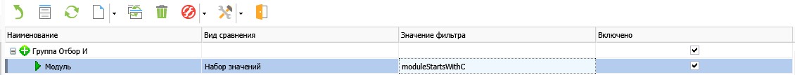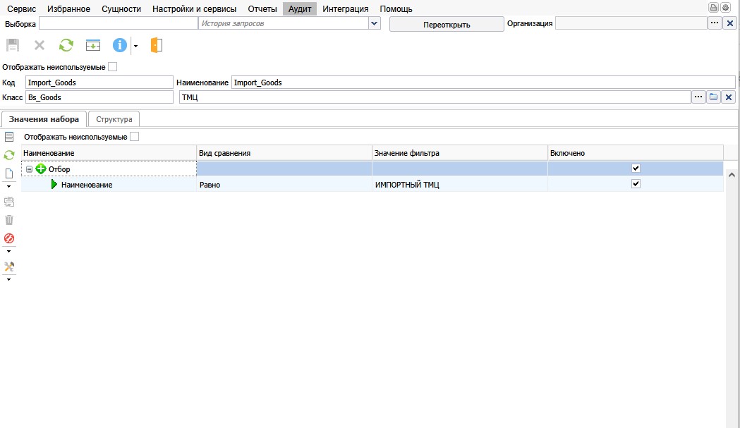 На вкладке Структура набора настраивается условие универсального фильтра, которое задает какие значения попадают в текущий набор значений.